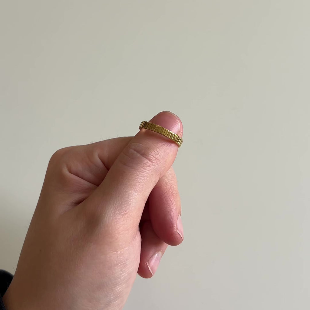 The ring The Striped – gold seduces with its structured and modern design. Its golden ring, adorned with fine regular grooves, subtly captures the light and gives the piece an elegant and contemporary charm. Each detail reflects a delicate graphic play, bringing texture and refinement to this creation.