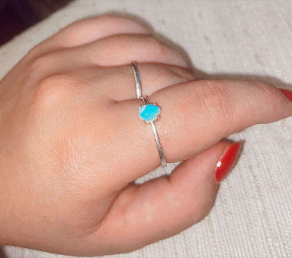 La larimar est associé à l'activation et à l'harmonisation du chakra de la gorge, favorisant une communication claire et authentique, ainsi qu'à l'ouverture du chakra du cœur, encourageant l'expression de l'amour inconditionnel envers soi-même et les autres. Porte la bague 'L'Aquarelle' pour bénéficier de l'équilibre émotionnel, de la tranquillité d'esprit et de la connexion spirituelle qu'elle offre.