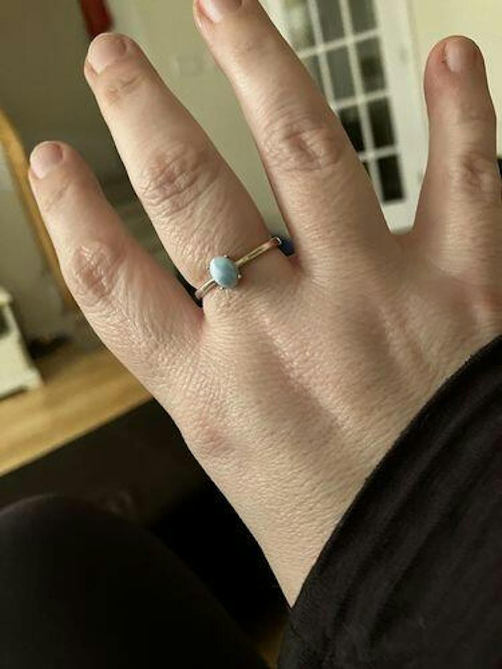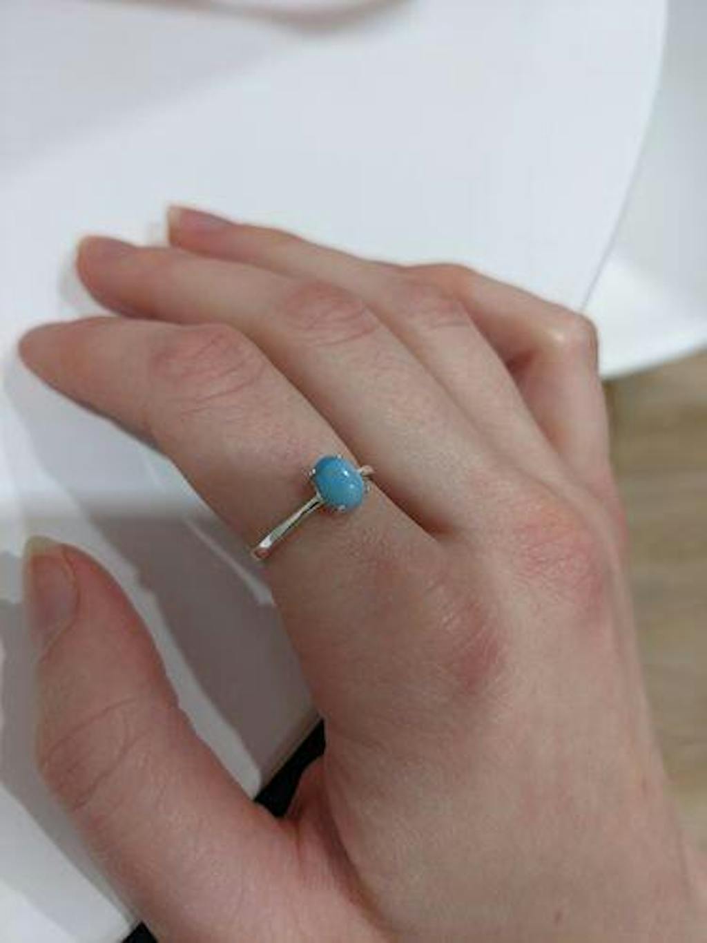 Découvre la bague 'L'Aquarelle', une pièce exquise ornée d'une véritable pierre de larimar, réputée pour ses propriétés apaisantes et harmonisantes. Cette pierre précieuse unique, aux nuances de bleus doux rappelant les eaux cristallines des Caraïbes d'où elle est originaire, apporte une sensation de calme et de sérénité à la personne qui la porte.