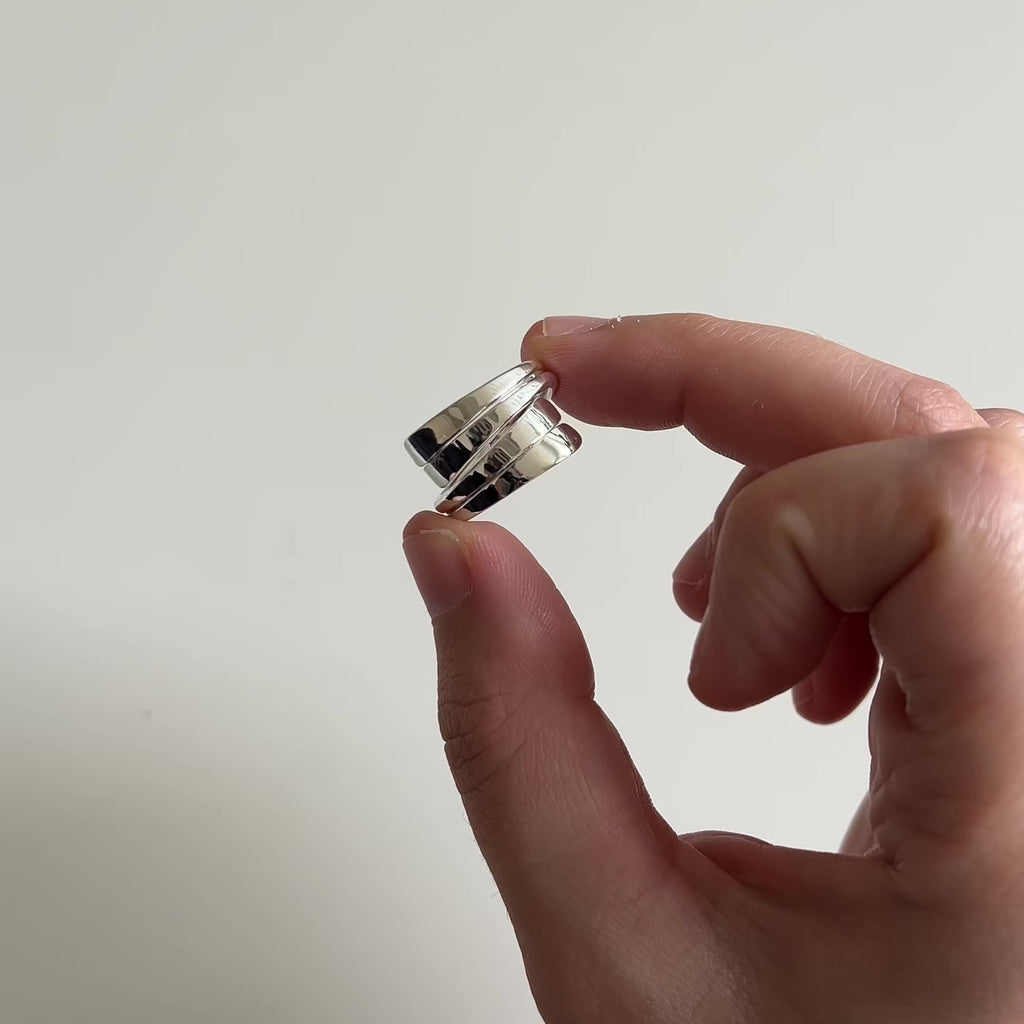 Avec ses lignes superposées et son design enveloppant, La Mirage incarne la fluidité et l’audace. Ses reflets argentés dessinent un jeu de lumière changeant, créant l’illusion d’un mouvement continu autour du doigt. Une bague à la fois architecturale et sensuelle.
