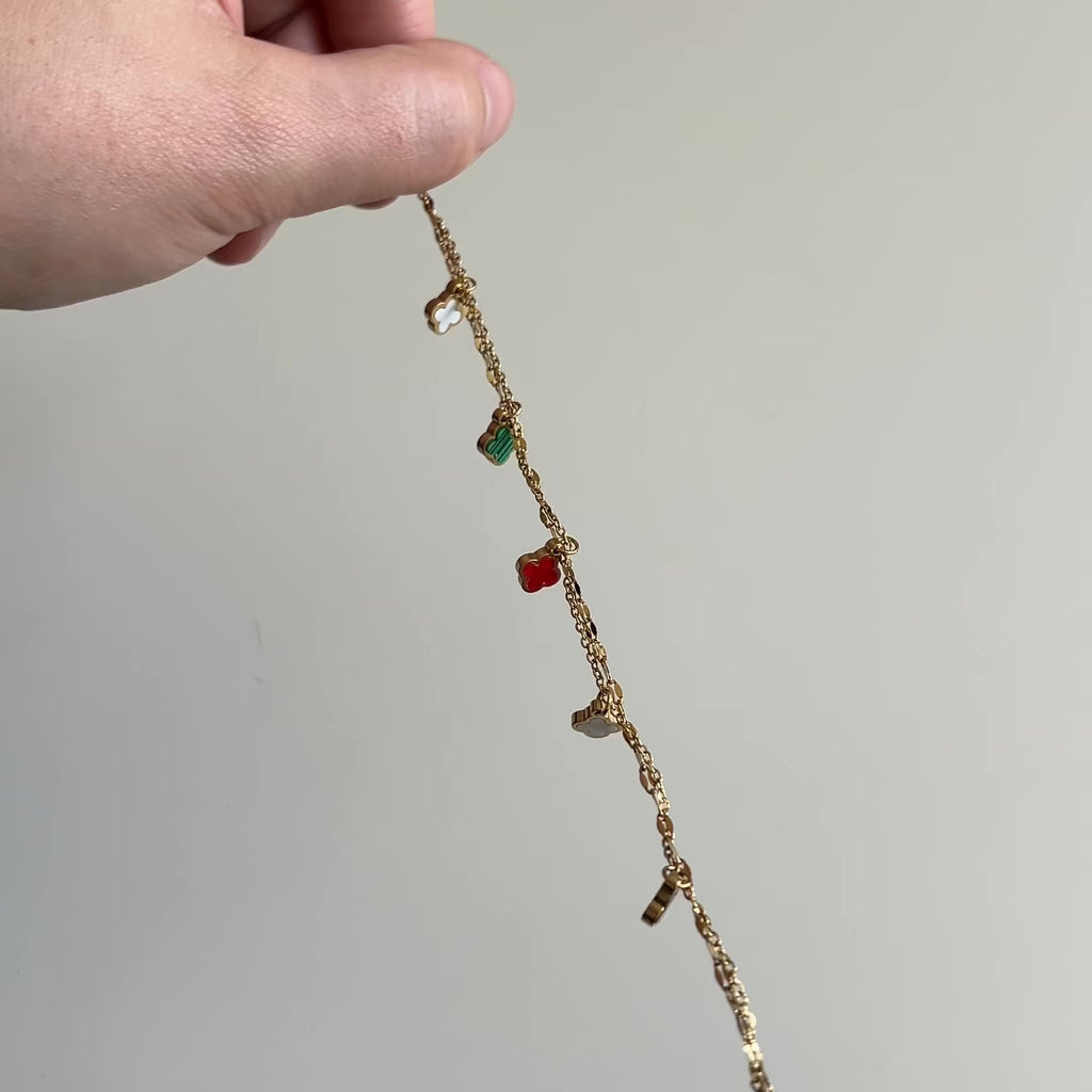 Ajoutez de la couleur et de la lumière à votre poignet avec Le Chroma, un bracelet doré à double chaîne orné de pendentifs en forme de trèfle. Chaque breloque, dans des teintes riches et contrastées (rouge, turquoise, blanc, noir), crée un bel équilibre entre minimalisme et audace.