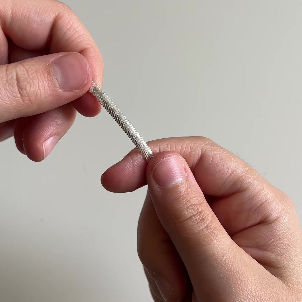 À savoir aussi : l’argent sterling est un métal naturellement malléable. Il peut donc légèrement se déformer avec le temps, surtout pour des pièces plus délicates comme les bagues ou les joncs ouverts. Si ça arrive, pas de panique : tu peux les remettre doucement en forme à la main ou à l’aide d’un petit objet cylindrique (comme le manche d’un pinceau à maquillage). C’est simplement une des caractéristiques normales de ce type de matériau.