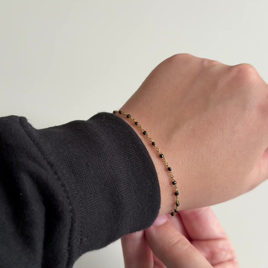 Le Nyx – Gold est un bracelet tendance orné de petites billes noires. Minimaliste et élégant, il s’agence facilement pour créer des looks modernes et stylés. Agencement mannequin : Le Halo & La Montagne-gold