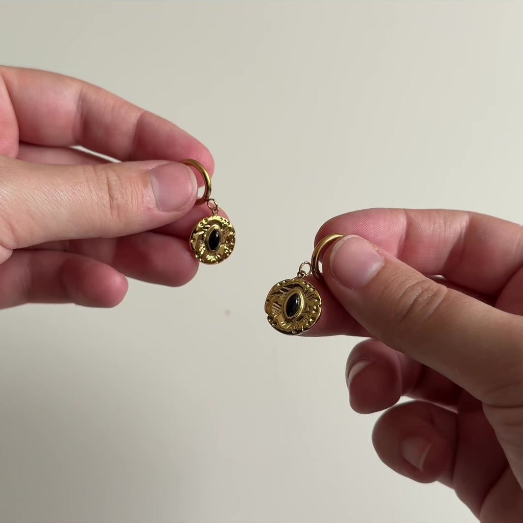 Élégantes et mystérieuses, Les Nocturnes – Gold sont des boucles d’oreilles dorées avec pendentif, sublimées par une délicate pierre d’onyx noir. Raffinement et profondeur au rendez-vous.