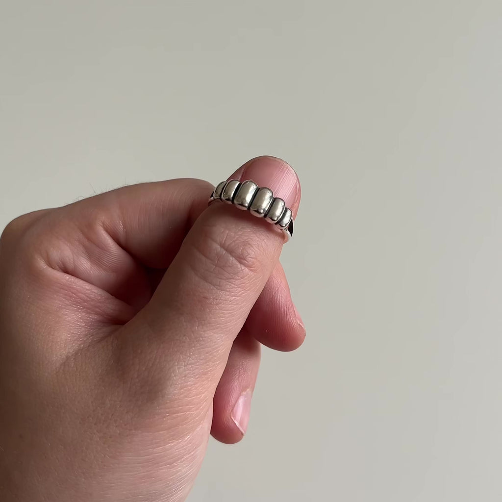 Portée seule, elle devient une pièce forte qui attire le regard par son caractère singulier et affirmé. Associée à d’autres bagues argentées ou serties de pierres, elle révèle toute sa polyvalence et s’intègre naturellement dans des jeux de superpositions, équilibrant légèreté et originalité.